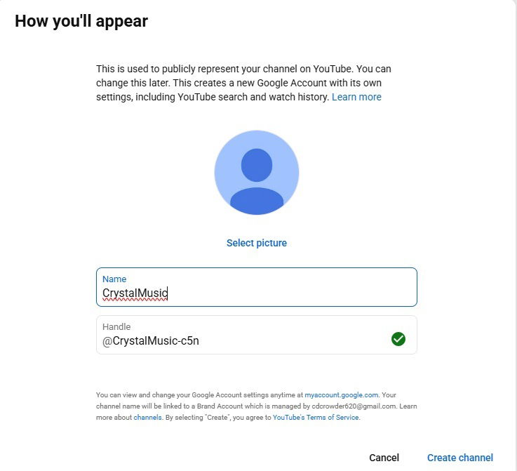 click *******CREE CHANGE*****,CLICK CREATE. your new profile or identity, you’re a brand new channel of s? This sounds like an entirely fresher to YouTube and Youtube Music. add name and handle for . It doesn’t matter what you use, but I like to put “music” in the name so it’s easy to know that it is my YouTube Music account. Click Create channel to complete the sentence.