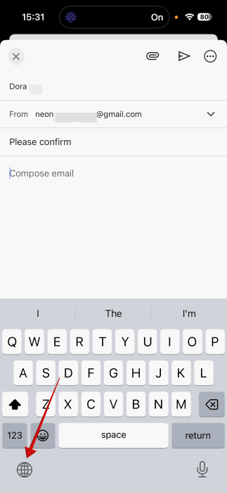 Press Compose, and open an app like Gmail or press Commposing. You will see the screen with a default virtual keyboard, which is your default one. Click on the globe icon at bottom left of the display.